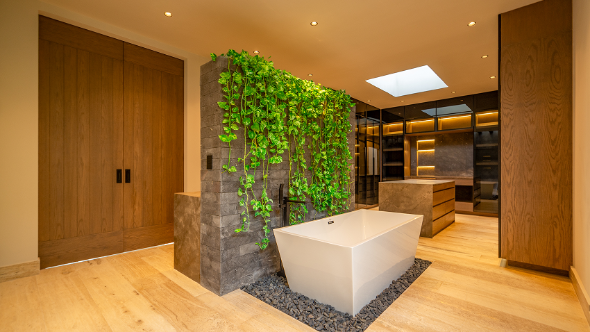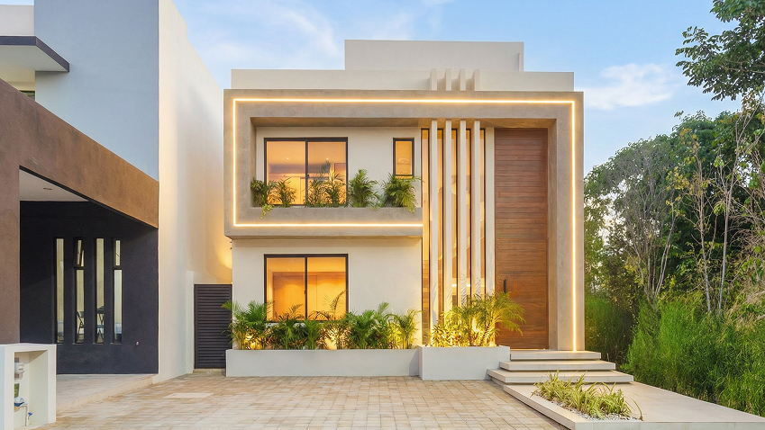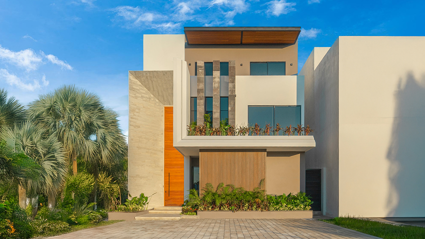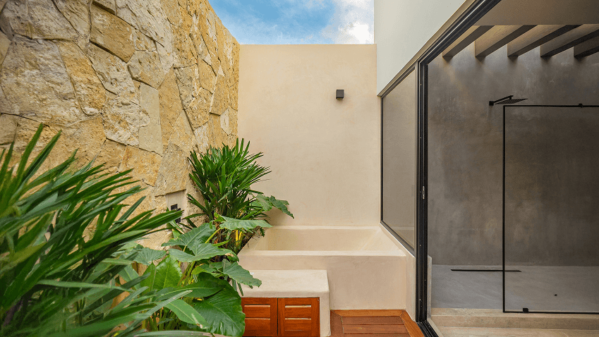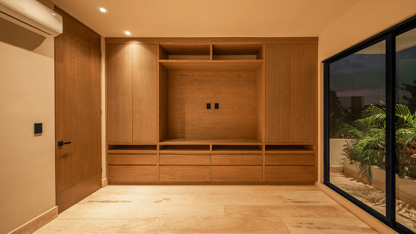 Cuenta con cuatro recámaras, reservando el último nivel a una suite principal concebida como un refugio íntimo, con vestidor tipo boutique y áreas húmedas abiertas al exterior, evocando un spa tropical privado.