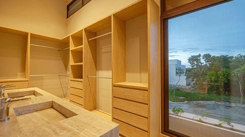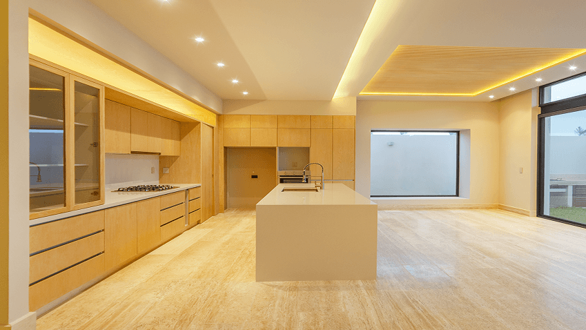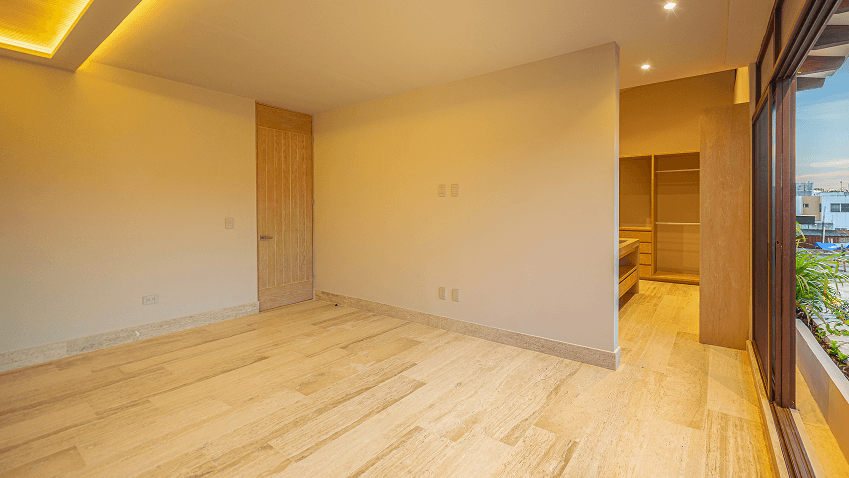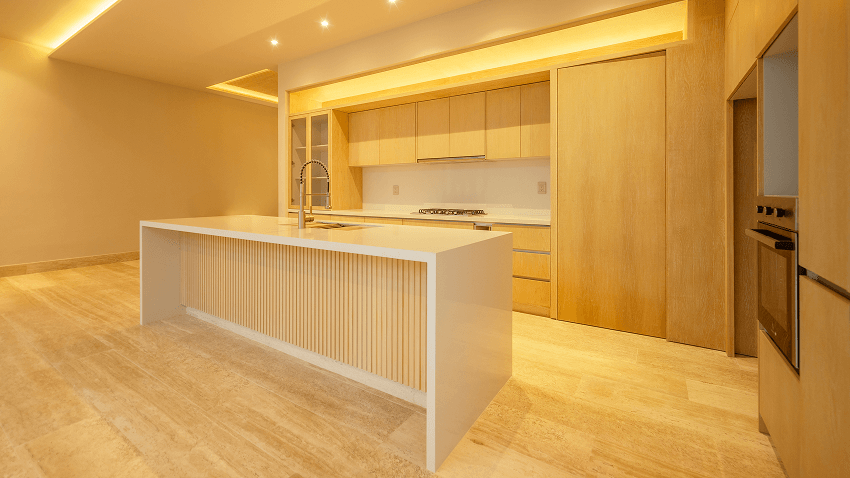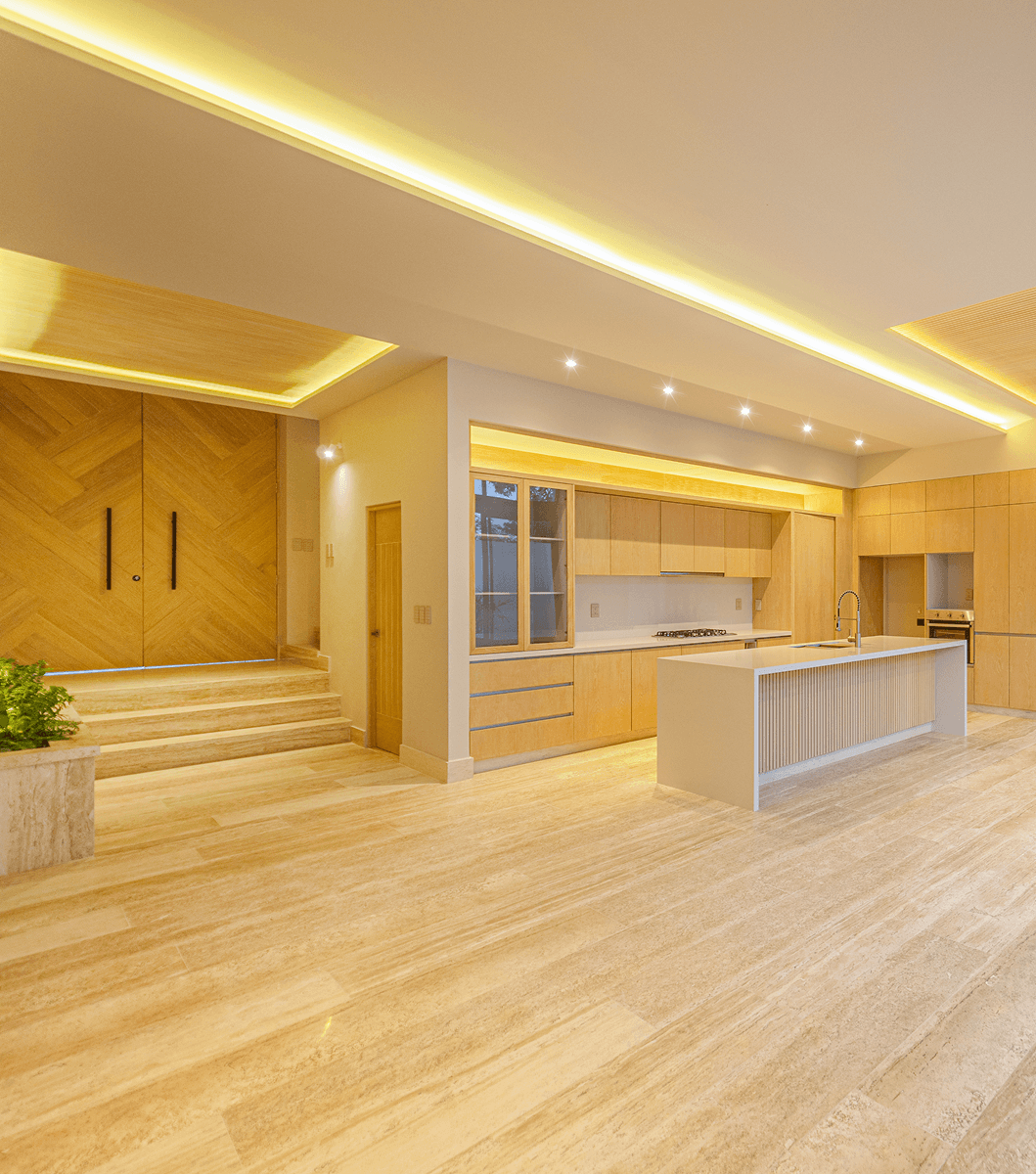 El corazón del proyecto es una cocina abierta, concebida como el eje desde el cual se organiza la casa. Su posición central permite una relación directa con sala, comedor y exterior. La materialidad acompaña esta continuidad con travertino mexicano veteado, encino nacional blanqueado, cantera nacional y detalles en galarza dorada, creando una atmósfera cálida y homogénea. La luz natural se filtra de manera controlada, reforzando la sensación de calma interior.